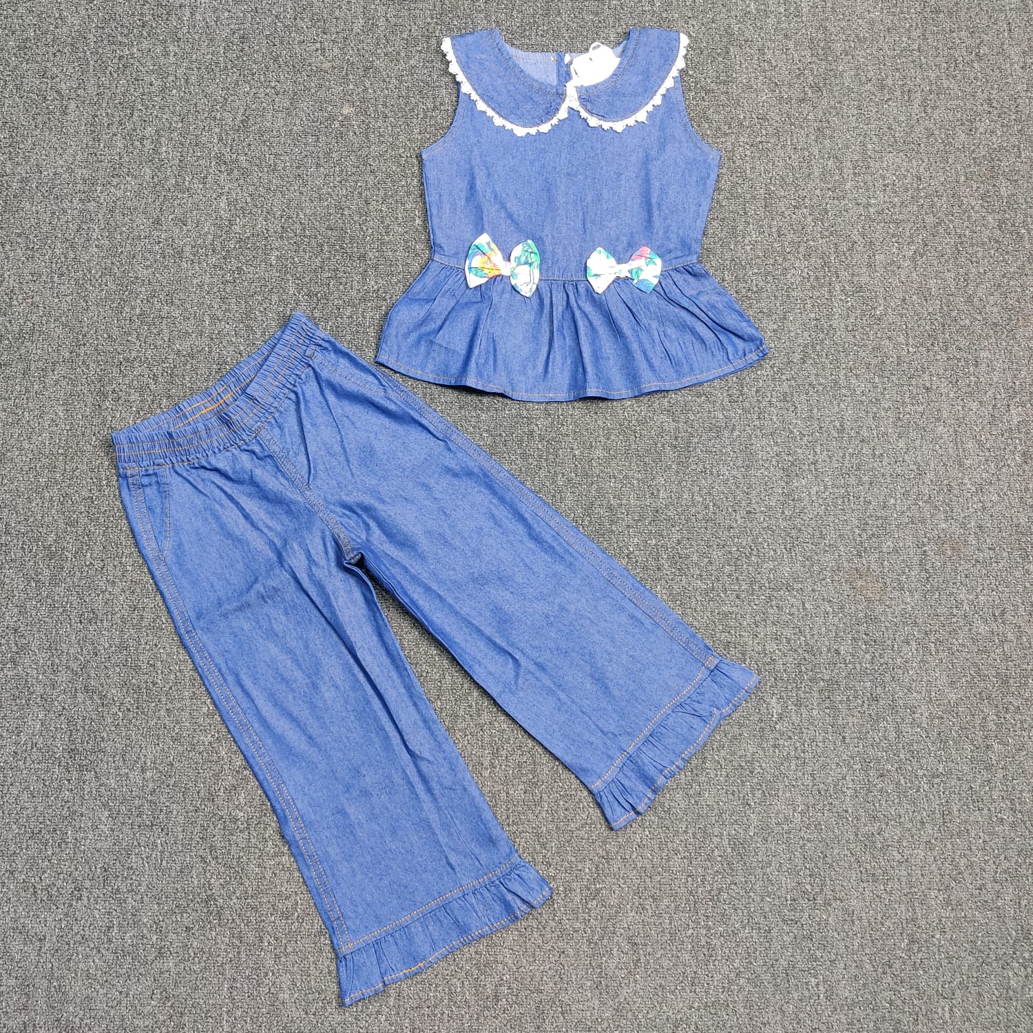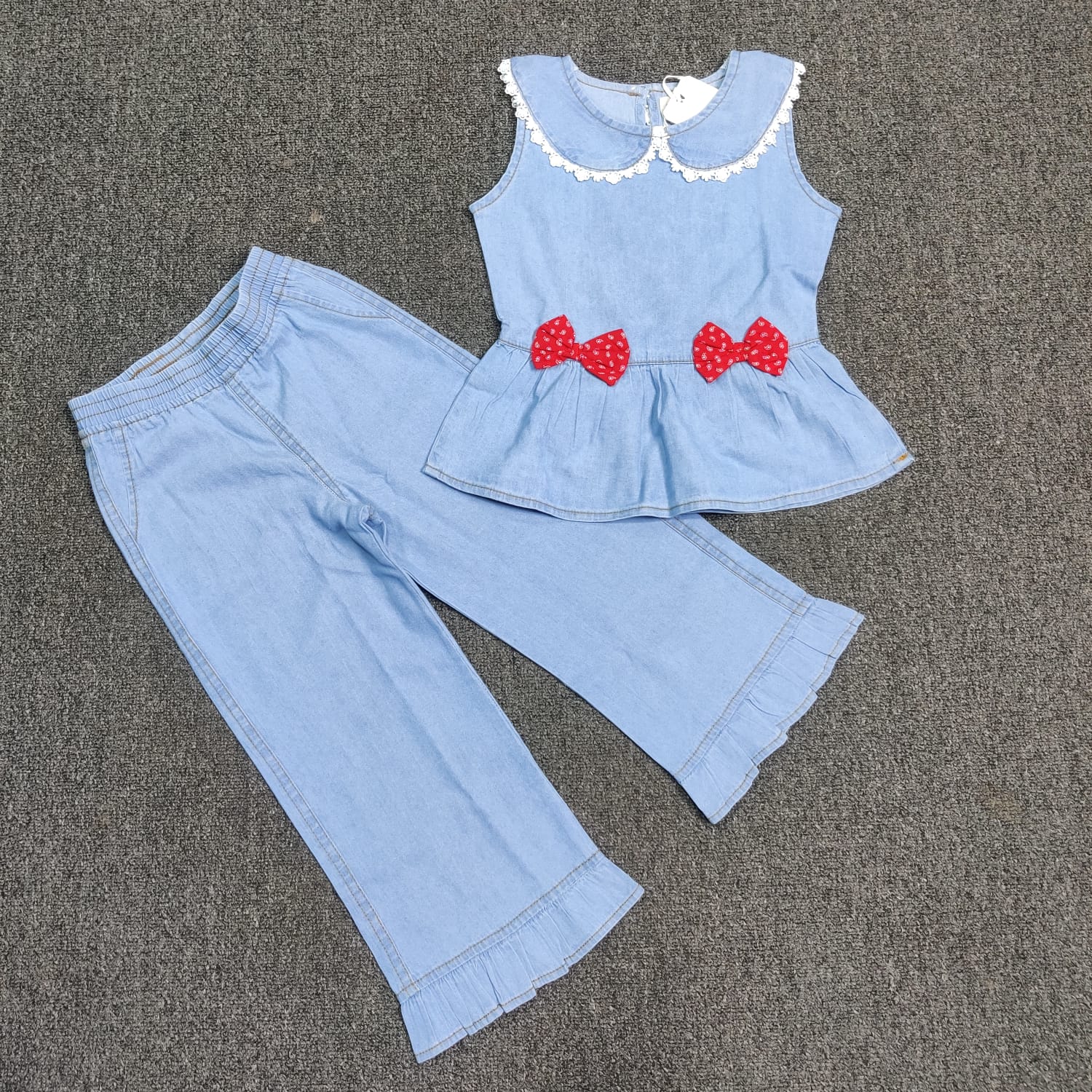 The top features a classic Peter Pan collar with delicate lace trim, full-length puff sleeves, and a sweet peplum flare finished with a matching bow. Paired with relaxed-fit denim pants accented with lace at the hem, this set creates a lovely coordinated look your child will love wearing.
